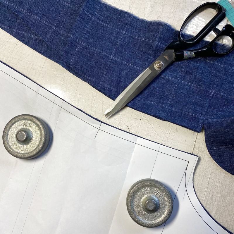ローラーカッターの場合は、カット用の定規もあるとよいと思います。 - 文鎮などでパターンを押さえます。大きいパーツでは、裁断する箇所の近くに文鎮を置き直しながらカットしましょう。