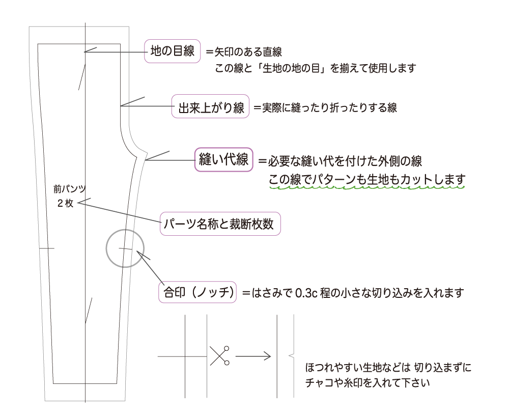 お届けする縫製レシピには『参考型入れ図』を掲載していますので、これを参考にして生地にパターンを配置し 裁断します。パターンにある「地の目線」と 「生地の地の目」を合わせましょう。