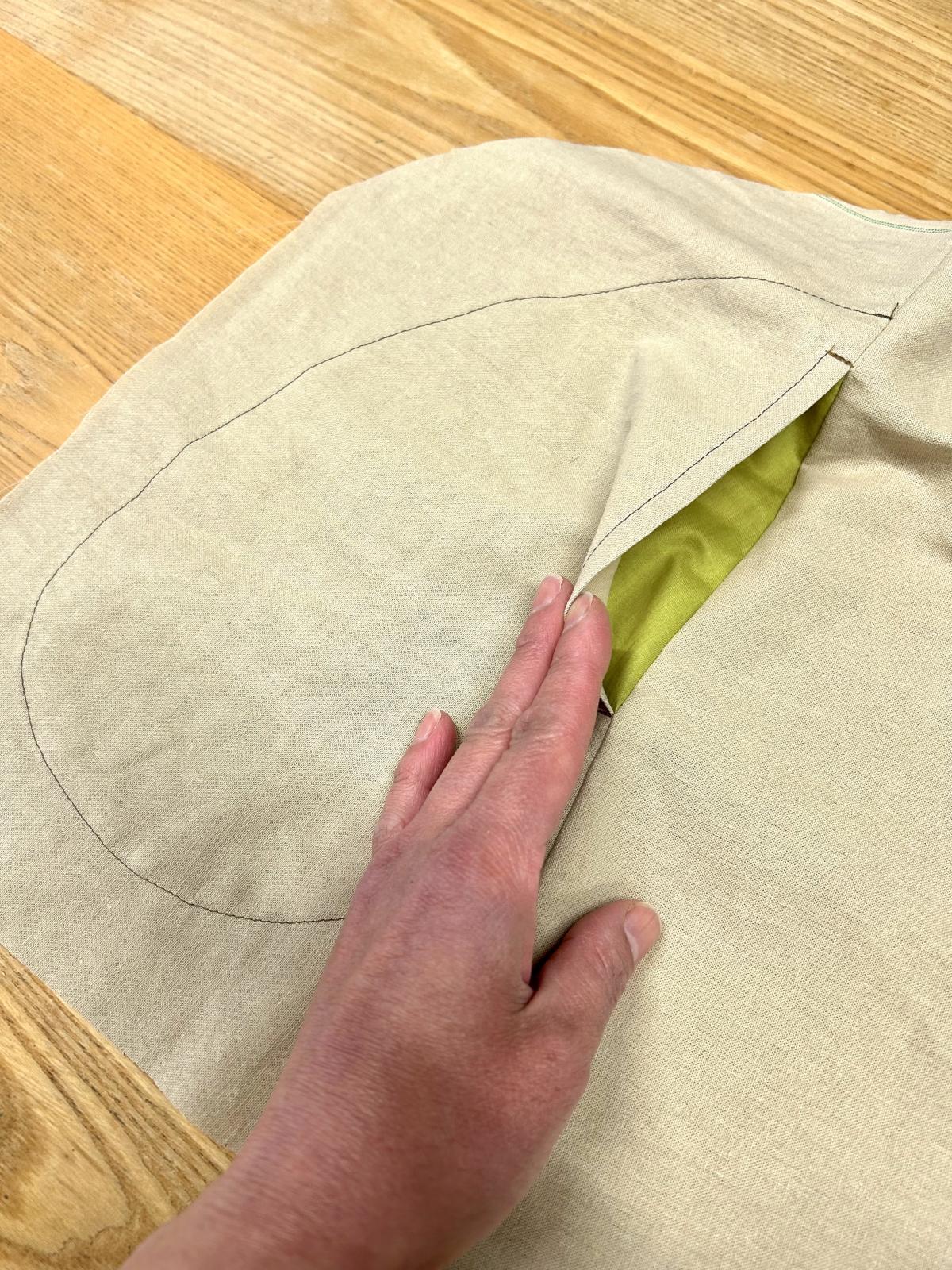 | 袋布は1枚のみ。 身頃裏面に袋布位置をチャコで写し、ステッチでたたき付ける仕様です。 |